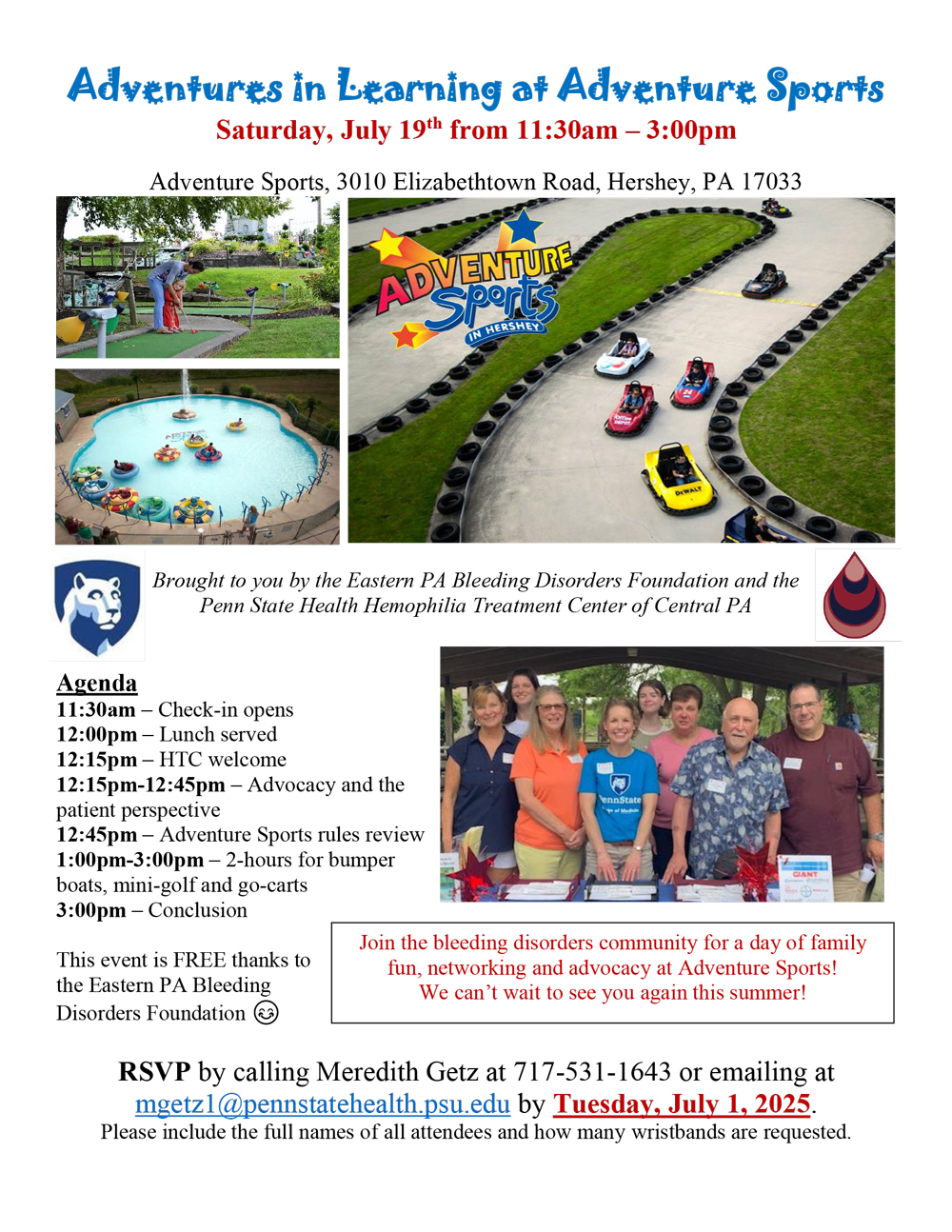 Please register before Friday, July 4, 2025.CALL Meredith Getz at 717-531-1643 or EMAIL Meredith Getz at mgetz1@pennstatehealth.psu.eduPlease include the full names of all attendees, their age (select breakout session), and how many wristbands are requested.